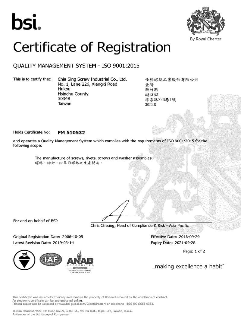 Chia Sing was founded in Taipei, Taiwan in 1972, specializing in the production of various industrial fasteners. Following the quality policy of "Customer Satisfaction", we have received support from domestic and foreign customers. In order to expand the market and production demand. Chia Sing Fastener Industry (Suzhou) Co., Ltd. was established in 1998.In terms of software, Chia Sing adopts ERP network management, fully implemented IATF16949, ISO9001 quality system, and supporting system ISO14001. In terms of hardware, advanced and diverse production equipment, the products cover the automotive, motor, electronics and other industries to meet the needs of different customers.